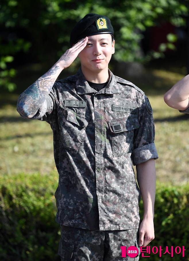 [텐아시아=조준원 기자]군 복무를 마치고 만기 전역한 그룹 방탄소년단(BTS)의 정국이 11일 경기도 연천군 연천공설운동장에 마련된 전역식 행사 자리에서 취재진들을 향해 경례 포즈를 하고 있다.