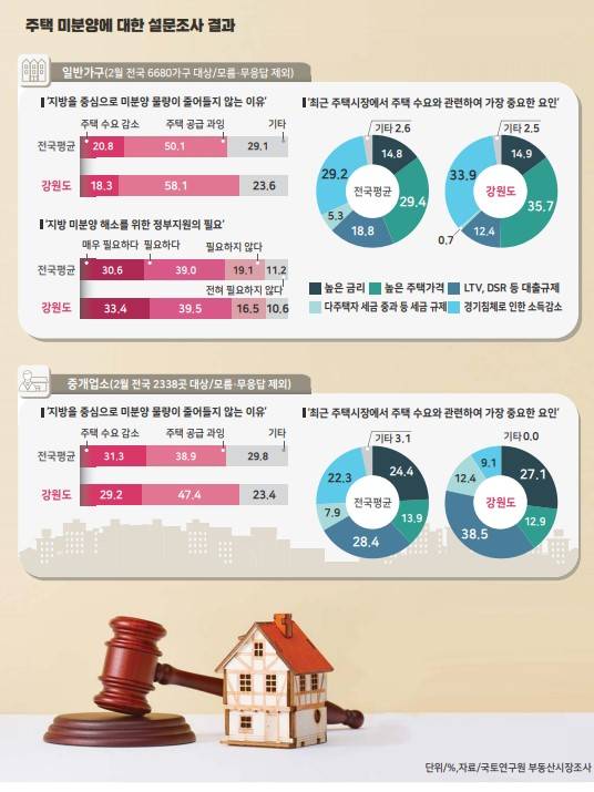 최근 국토연구원이 일반가구를 대상으로 ‘지방을 중심으로 미분양 물량이 줄어들지 않는 이유’에 대해 설문한 결과, 전국 기준 ‘주택 공급 과잉(50.1%)’이 가장 높은 응답률을 보인 가운데 강원지역은 전국평균보다 높은 68.1%의 응답률을 보였다. 또 ‘최근 주택시장에서 주택 수요와 관련해 가장 중요한 요인’에 대한 설문에서는 전국 기준 ‘높은 주택가격(29.4%)’이 가장 높은 응답률을 보인 가운데 ‘경기침체로 인한 소득감소(29.2%)’, ‘대출규제(18.8%)’ 순으로 답했다. 강원지역은 ‘높은 주택가격(35.7%)’, ‘경기침체로 인한 소득감소(33.9%)’ 모두 전국 평균보다 응답률이 높았다. 강원도민이 타시도민보다 주택구입에 대한 부담이 더 큰 것으로 해석된다. 미분양 해소를 위한 정부지원 필요성에 대해서도 강원도민 33.4%는 매우 필요하다고 응답했고 필요하다는 응답도 39.5%에 달했다.