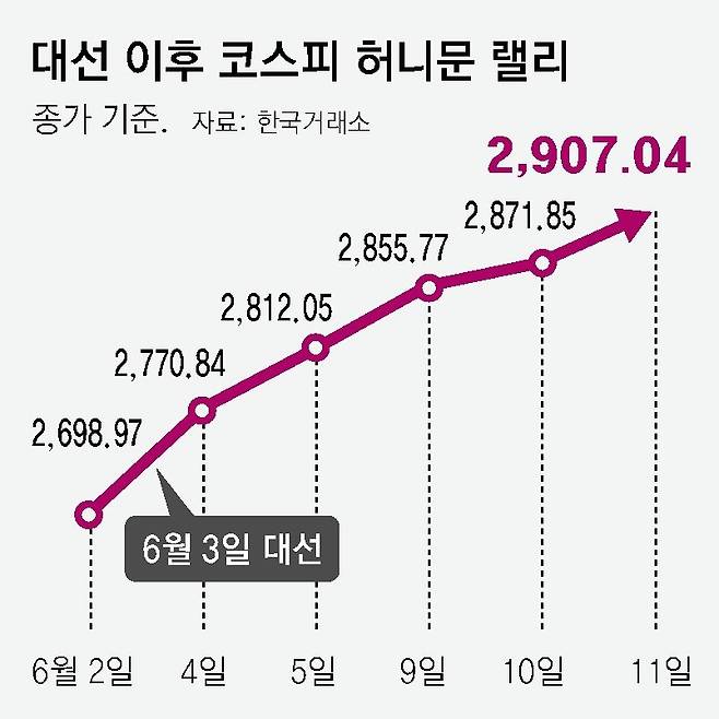 ‘코스피 5,000시대’를 공약했던 이재명 대통령이 11일 직접 여의도 한국거래소를 방문해 간담회를 가진 가운데 새 정부에서 증시 부양에 적극적으로 나설 것이란 기대도 커지고 있다는 평가다. 추가경정예산 집행 등으로 내수 부양에 힘을 싣는 한편 인공지능(AI), 방산, 바이오 등 전략 산업에 대한 대규모 투자도 약속한 상태이기 때문이다. 상법 개정안 등을 통한 기업지배구조 개선 가능성도 증시에 긍정적인 영향으로 작용하고 있다.