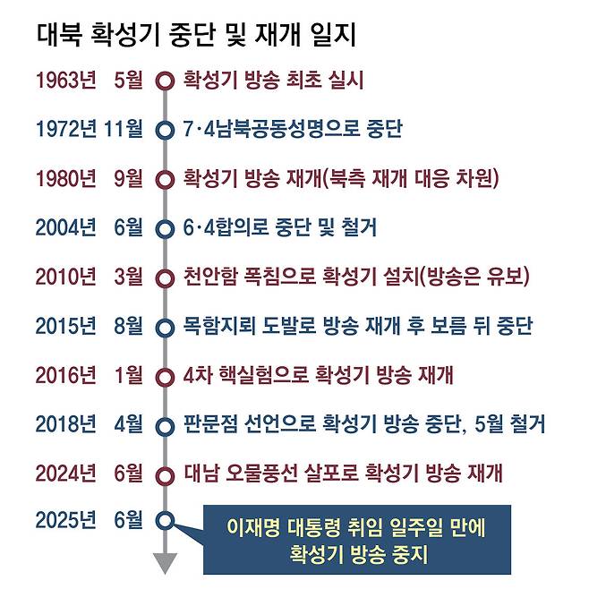 정부는 윤석열 정부 때인 지난해 6월 긴급 국가안전보장회의(NSC) 상임위원회를 열고 문재인 정부에서 중단했던 확성기 방송을 6년 만에 재개하기로 결정했다. 북한이 대북전단 살포를 비판하며 오물풍선을 살포하자 정부가 9·19남북군사합의 효력 정지와 함께 북한을 겨냥한 심리전 수단을 꺼내 든 것. 이후 군은 매일 최대 30km까지 방송이 전달되는 확성기를 통해 한국의 발전상과 ‘김씨 일가 3대 세습’ 및 북한 인권 실태 비판, K팝 등 대북 심리전 방송(자유의 소리)을 송출해 왔다.