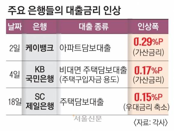 인터넷전문은행 케이뱅크 역시 지난 2일 아파트담보대출 가산금리를 0.29% 포인트 올렸고, SC제일은행은 오는 18일부터 주담대 영업점장 우대금리를 0.15% 포인트 축소한다.