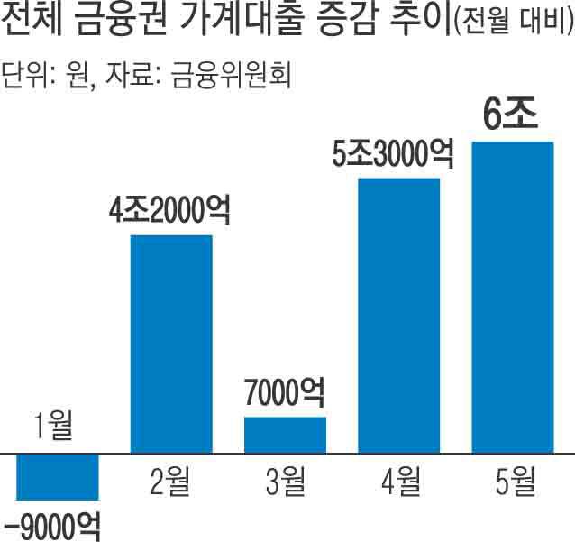 이날 금융위원회·금융감독원이 내놓은 ‘5월 가계대출 동향’ 자료에 따르면 2금융권까지 포함한 금융권 전체의 가계대출은 6조원 증가했다. 전월(5조3000억원)보다 증가폭이 더 커졌다. 가계대출은 올해 1월 9000억원 감소했다가 이후 넉 달째 증가세를 보이고 있다.