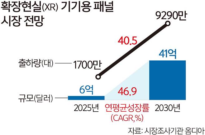시장조사기관 옴디아에 따르면 전 세계 XR용 패널 시장 규모(매출기준)는 올해 약 6억달러(약 8200억원)에서 2030년 41억달러(약 5조6000억원)로 향후 5년간 연평균 성장률이 46.9%에 달할 것으로 추정된다.