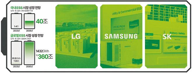 리서치 전문 블룸버그NEF에 따르면 글로벌 ESS 시장은 2022년 91.5GWh 연간 152억 달러(약 21조원) 규모에서 2030년 1432GWh 연간 2620억 달러(약 360조원)로 비약적으로 성장할 전망이다. 시장조사업체 SNE리서치도 글로벌 ESS 시장 규모가 2023년 기준 약 185GWh에서 2035년 약 1232GWh로 성장할 것으로 내다봤다.