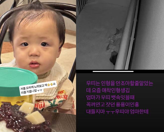 이어 똘망 똘망한 눈망울로 정면을 응시 중인 아들의 모습과 함께 "나를 이렇게 노려보고 깩 소리를 지른다"며 눈물을 흘리는 이모티콘을 덧붙였다.