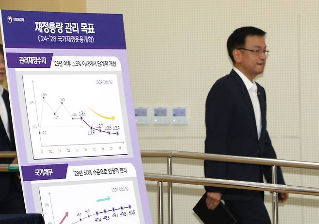 | ▲ 2024년 8월 22일 당시 최상목 부총리 겸 기획재정부 장관이 정부세종청사 민원동 브리핑실에서 2025년 예산안 및 2024~2028 국가재정운용계획에 관해 사전 브리핑하기 위해 입장하고 있는 모습. |