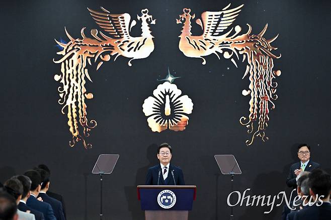 | ▲ 이재명 대통령이 지난 4일 오전 서울 여의도 국회 의사당에서 열린 제21대 대통령 취임선서식에서 취임선서를 마치고 있다. 이 대통령 뒤로 봉황 문양이 보인다. |