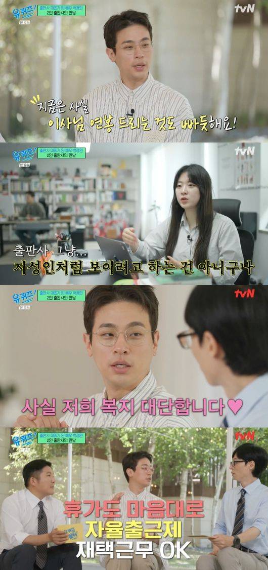 그런 가운데 박정민은 아침 10시 출근해 오후 5시 퇴근한다며, 하루 7시간 근무가 정해져 있어 “직원에게 퇴근하라고 한다. 근데 직원이 안 간다”라며 “휴가도 마음대로 쓸 수 있고, 재택근무도 가능하고 출근 자유롭다. 회사 복지가 많다”고 자부하면서도 너무 바빠 쓸 시간이 없다고 털어놨다.