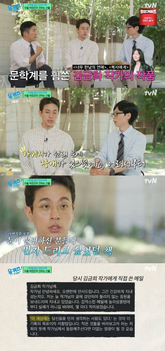 한편, 박정민은 시각 장애를 앓고 계신 아버지를 위해 오디오북을 기획했다고 밝혀 눈길을 끌었다. 그는 2021년부터 기획을 시작해 4년 만에 완성했다며 김금희 작가의 소설을 소개했다.
