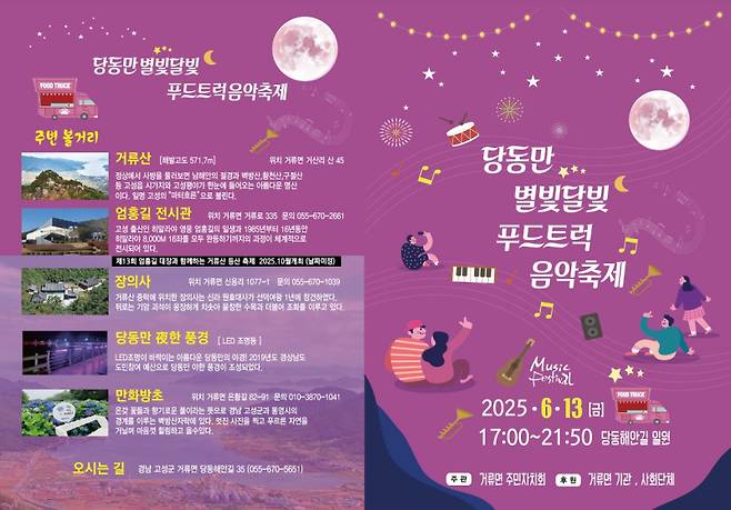 경남 고성군 거류면(면장 유정옥)은 6월13일 '당동만 별빛달빛 푸드트럭 음악축제'를 거류면 당동해안길 일원에서 개최한다.