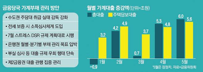 문제는 잇단 규제에도 당분간 대출 증가세가 이어질 것으로 예상된다는 점이다. 주담대에 앞서 움직이는 수도권 주택 매매량은 1월 1만3000가구에서 4월 2만5000가구로 뛰었다. 내수 침체로 한국은행이 기준금리를 계속 내릴 것으로 관측된다는 것도 변수다. 박민철 한국은행 시장총괄팀 차장은 “5월 주택 거래량 추세로 미뤄볼 때 7~8월까지 가계대출 증가세가 이어질 것 같다”고 전망했다.