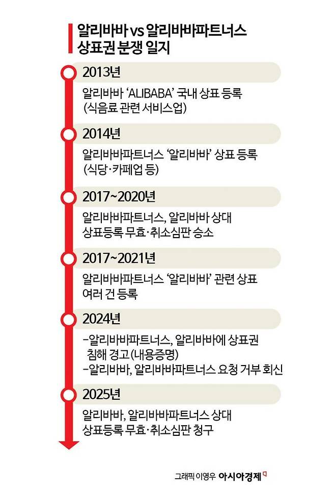 한편 지난해 9월 알리바바파트너스는 알리바바에 내용증명을 보내 상표권 침해 중지를 요청하며 따르지 않을 경우 소송과 함께 형사고소를 진행하겠다고 경고했다. 알리바바가 온라인 쇼핑몰 알리바바닷컴, 알리익스프레스를 통해 국내에서 식음료를 판매하며 상표권을 침해하고 있고, 특허심판원이 앞서 식음료업에 대한 알리바바의 국내 상표권을 취소하는 결정을 내렸던 만큼 상표권 침해에 대한 고의성이 있다는 취지였다. 하지만 알리바바는 이 같은 요청을 수용할 수 없다는 답변을 보냈고 몇 달 뒤 상표등록 무효·취소 심판을 청구했다.