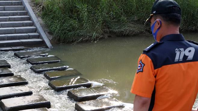 이 사고는 물총놀이를 하던 초등생 무리 중 2명이 이끼 낀 징검다리에서 미끄러져 하천에 추락하면서 발생했습니다.