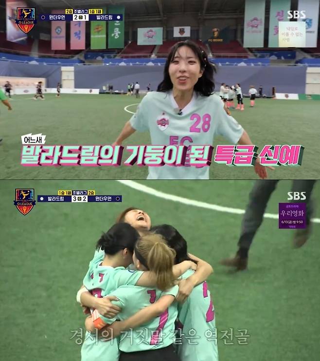 지난 11일 방영된 SBS <골 때리는 그녀들>(아래 <골때녀>) G리그 FC 발라드림 대 FC 원더우먼의 경기에서 발라드림이 먼저 2골을 내주고도 내리 3골을 성공시키는 기적 같은 역전극을 펼치며 3대2 승리를 거뒀다. 이제 발라드림은 1패 뒤 2연승을 기록하면서 4강 토너먼트 직행을 위한 발판을 마련했다.