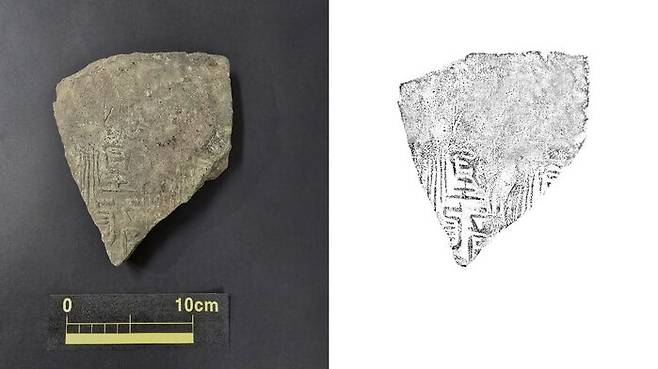 이 글자 형태는 황룡사 남문지 동편 건물지와 강당지 북동편지구 출토품, 동아대 박물관 소장품 등과 같은 것입니다.