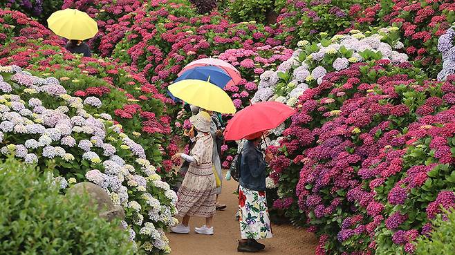 ▲ 제주도에 이른 장마가 시작된 12일 오전 제주 서귀포시 안덕면 덕수리 카페 마노르블랑을 찾은 관광객이 우산을 쓰고 수국이 만개한 정원을 산책하고 있다.