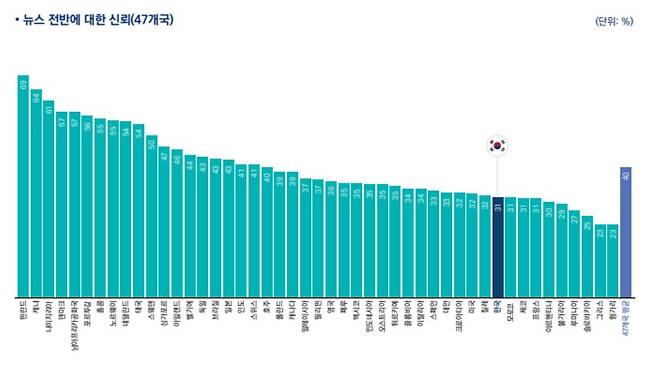 | ▲ 2024년 한국의 뉴스 전반에 대한 신뢰도는 31%를 기록했다. 이는 조사대상 47개국 가운데 38위에 그친 수치다. |