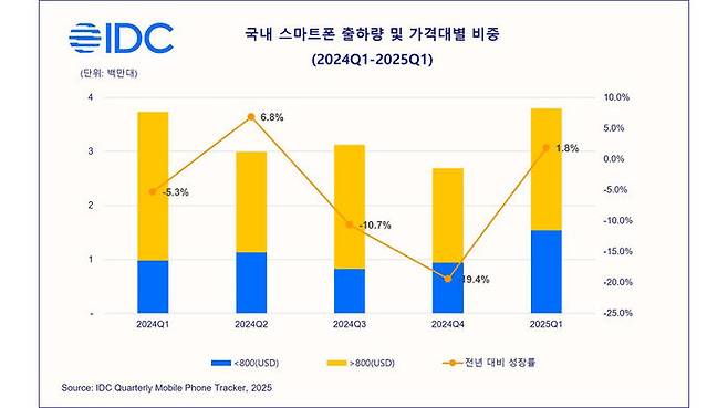 가격대별로는 800달러 이상의 플래그십 제품군 점유율이 전년 동기보다 급감해 59.5%를 기록했습니다.