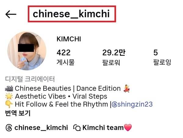 팔로워 30여만명을 거느린 중국의 한 누리꾼이 인스타그램 아이디를 '차이니즈 김치'로 만들어 운영하며 논란을 빚고 있다.