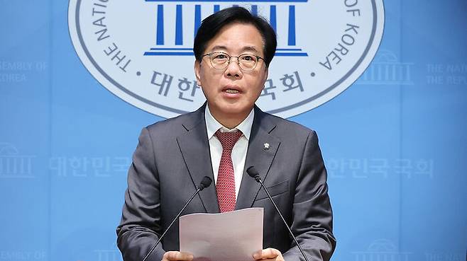 ▲ 국민의힘 송언석 의원이 12일 서울 여의도 국회 소통관에서 원내대표 출마 선언을 하고 있다.