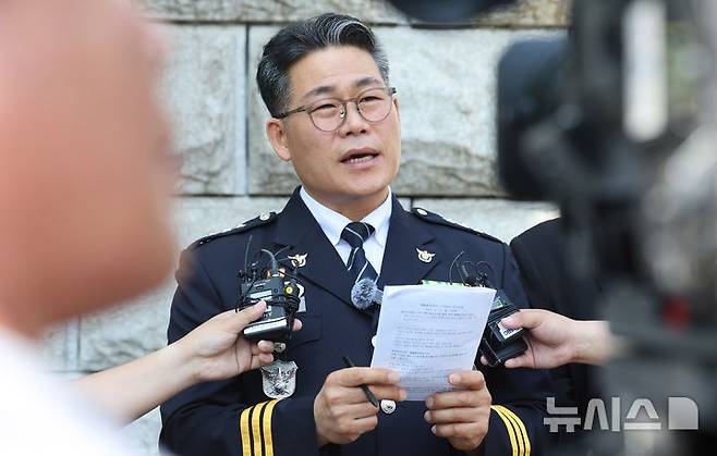 [서울=뉴시스] 추상철 기자 = 전 영등포경찰서 형사과장인 백해룡 경정이 12일 오전 서울 서초구 대검찰청 앞에서 '세관 마약밀수 연루 의혹'과 관련해 합동수사팀 출범에 대한 입장 발표를 하고 있다. 2025.06.12. scchoo@newsis.com