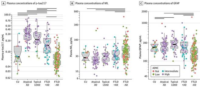 그 결과, 사후에 측정된 혈액검사에서 알츠하이머병 환자군이 지닌 p-tau217 농도(평균 0.28 pg/mL)가 전두측두엽 치매 환자(평균 0.10 pg/mL)보다 혈액 내 농도 보다 크게 높았다.(P< .05). 알츠하이머병이 동반된 전두측두엽 치매 환자가 보인 p-tau217 농도(평균 0.19 pg/mL)도 알츠하이머병이 없는 경우(평균 0.07 pg/mL)보다 유의미하게 높았다.