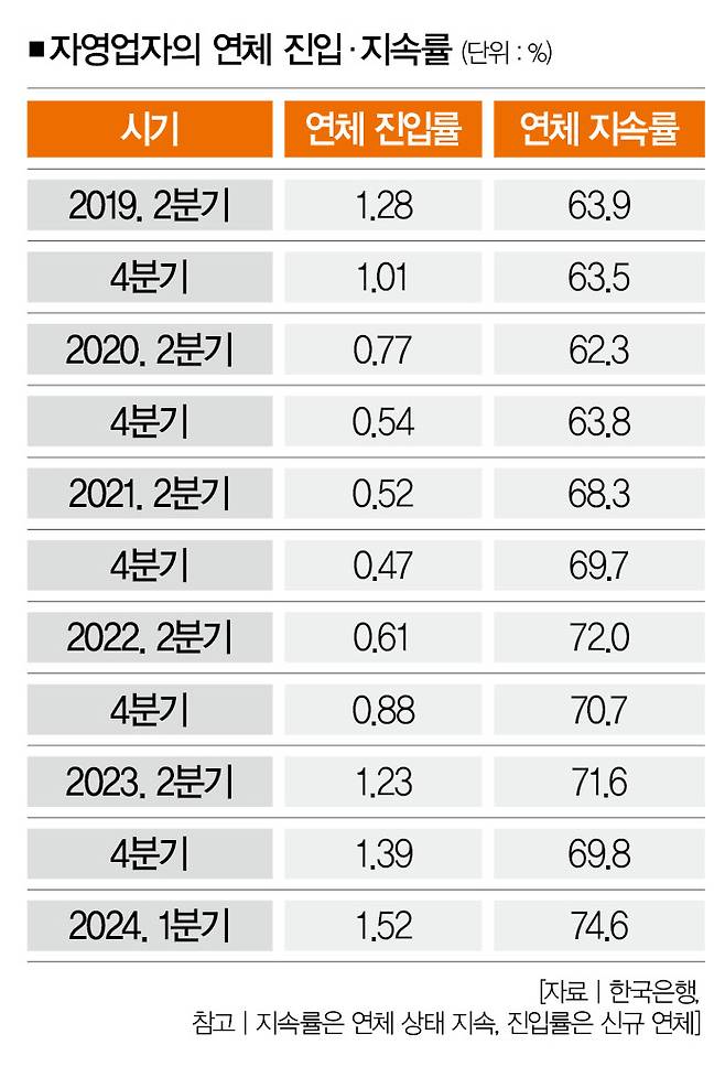 한국은행이 지난해 6월 발표한 금융안전성 보고서를 보면, 자영업자 연체 지속률은 2019년 2분기 63.9%에서 2022년 2분기 72.0%, 2023년 2분기 71.6%, 2024년 1분기 74.6%로 상승하고 있다. 한번 연체에 빠지면 빠져나오기 힘들다는 얘기다.