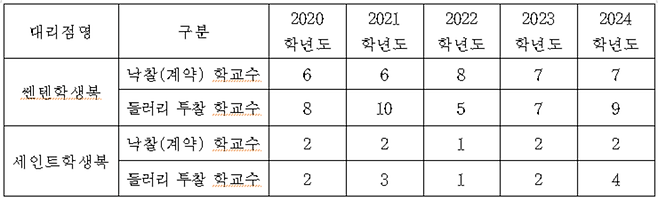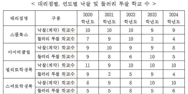 낙찰받을 학교를 정할 때 신입생 수를 기준으로 스쿨룩스, 아이비클럽, 엘리트학생복, 스마트학생복 4사는 비슷한 학생 수가 되도록 계약할 학교를 정하고, 쎈텐학생복만 4사 대비 65%~80% 정도의 학생 수가 되도록 학교를 정했습니다. 세인트학생복은 2~3개 학교에만 배정됐습니다.