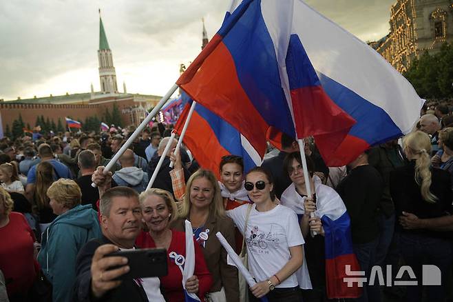 [모스크바=AP/뉴시스] 11일(현지 시간) 러시아 모스크바 붉은광장에서 열리는 러시아의 날(12일) 기념 콘서트를 앞두고 관람객들이 러시아 국기를 흔들며 셀카를 찍고 있다. ‘러시아의 날’은 1990년 6월 12일, 러시아 공화국 인민대표회의가 국가 주권 선언을 채택한 것을 기념하는 날이다. 2025.06.12.