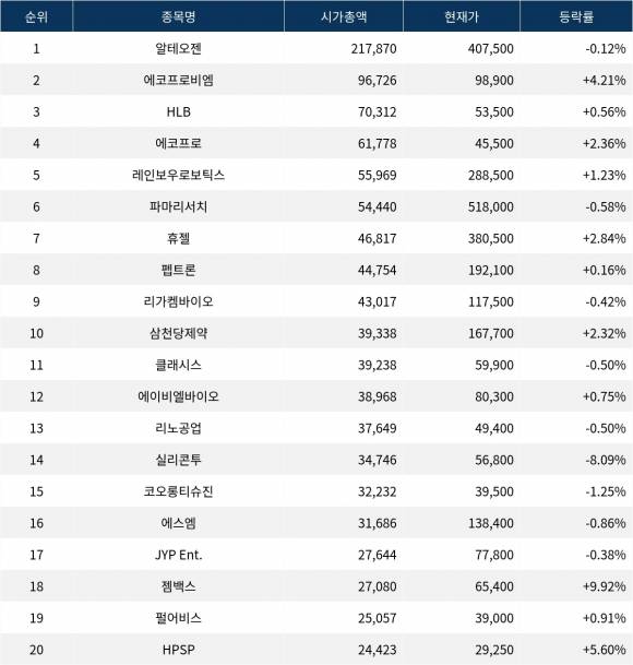현재 시가총액 1위인 알테오젠(196170)은 407,500원으로 전 거래일 대비 0.12% 하락하며 보합세를 보이고 있다. 상장주식수 53,465주에 외국인비율이 14.92%인 알테오젠은 PER 174.37, ROE 29.52로 높은 수익성을 나타내고 있다. 한편, 2위인 에코프로비엠은 98,900원으로 4.21% 상승하였으며 거래량 488,434주를 기록하며 활발한 거래가 이루어지고 있다. 외국인비율은 11.41%로 양호한 수급 상황을 보이고 있으나, PER -104.21, ROE -6.26으로 재정 상태는 다소 불안정하다.