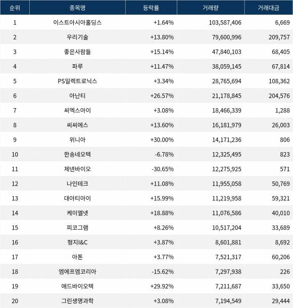 코스닥 거래량 2위 우리기술(032820) 3위 좋은사람들(033340) 4위 파루(043200)