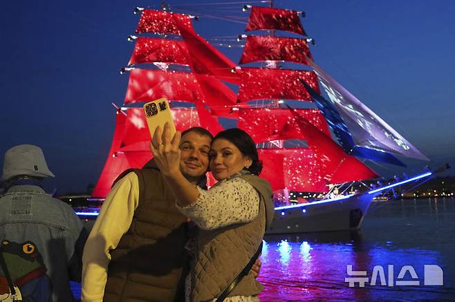 [상트페테르부르크=AP/뉴시스] 12일(현지시각) 러시아 상트페테르부르크 네바강에서 러시아 고교생과 사관 학생 졸업생 축제인 '붉은 돛 축제'(스칼릿 항해) 예행연습이 열린 가운데 한 커플이 주홍색 돛 범선을 배경으로 셀카를 찍고 있다. 올해 '붉은 돛 축제'는 오는 28일로 예정돼 있다. 2025.06.12.