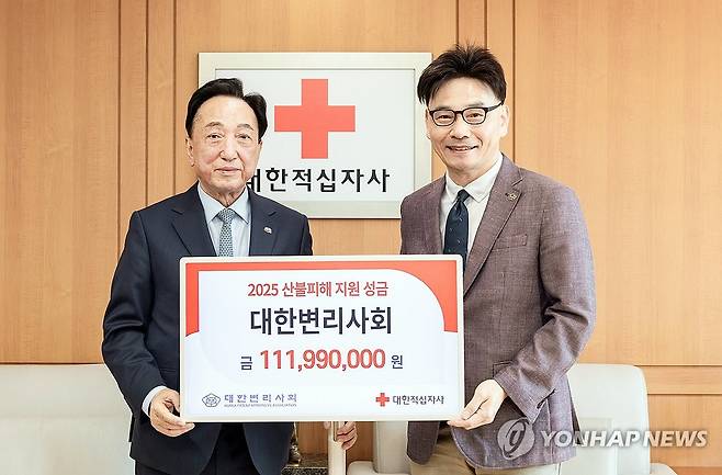 (대전=연합뉴스) 김두규 대한변리사회 회장(오른쪽)이 12일 대한적십자사를 방문, 김철수 대한적십자사 회장에게 경북지역 산불 피해복구 성금 1억1천199만원을 전달하고 기념 촬영을 하고 있다. 대한변리사회는 산불 피해를 본 주민들을 돕기 위해 지난 5월 한 달간 회원들을 대상으로 모금 활동을 펼쳤다. 2025.6.12 [대한변리사회 제공. 재판매 및 DB 금지]