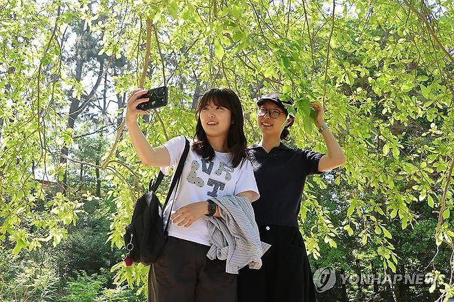 (태안=연합뉴스) 정윤덕 기자 = 아시아 최초로 국제수목학회 '세계의 아름다운 수목원' 인증을 받은 충남 태안 천리포수목원은 본격적인 여름을 알리는 형형색색 꽃들이 수목원을 수놓고 있다고 12일 밝혔다. 지난 11일 천리포수목원을 찾은 탐방객들이 연둣빛 이파리와 아래로 축 처진 가지가 인상적인 닛사나무를 배경으로 사진을 찍고 있다. 2025.6.12 [천리포수목원 제공. 재판매 및 DB 금지]