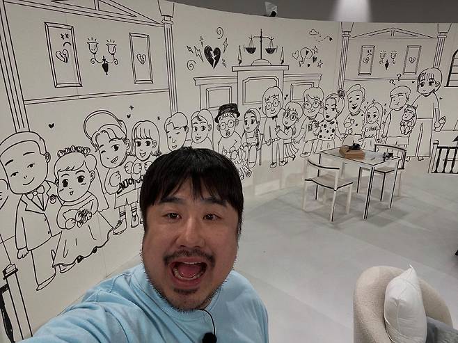 12일 강재준은 자신의 SNS에 "뒤에 그림 은형이가 다 그렸다는"이라는 짧은 글과 함께 한 장의 사진을 게재했다. 공개된 사진 속 강재준은 환한 미소를 지으며 카메라를 향해 셀카를 찍고 있다. 눈에 띄는 건 그가 서 있는 배경. 벽면 가득 펼쳐진 대형 캐리커쳐 벽화에는 팽현숙, 최양락 부부와 김학래, 임미숙 부부, 김지혜, 박준형 부부 등 JTBC 예능 '1호가 될 순 없어2'에 출연 중인 개그맨 부부 협회 회원들의 모습이 만화 스타일로 유쾌하게 그려져 있다. 특히 강재준 캐리커쳐에는 아들 현조 군의 모습도 담겨 귀여움을 자아낸다.