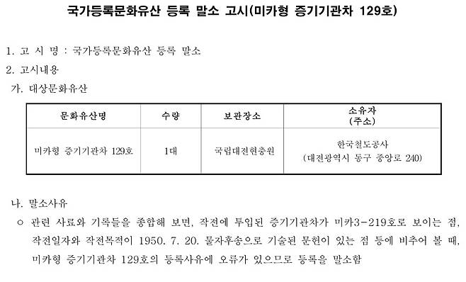 하지만 국가유산청은 <오마이뉴스> 보도 후 4년 여가 지나서야 재검증 절차에 나서 이날 등록 말소 사실을 알렸다. 국가유산청은 말소 사유로 "관련 사료와 기록들을 종합해 보면, 작전에 투입된 증기기관차가 미카3-219호로 보이는 점, 작전일자와 작전목적이 1950. 7. 20. 물자후송으로 기술된 문헌이 있는 점 등에 비추어 볼 때 오류가 있다"고 설명했다.