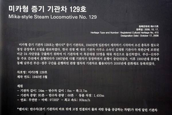 국가유산에서 제외된 미카-129호는 1940년 일본에서 제작을 시작해 조선총독부 철도국 경성공장에서 조립한 텐더식 증기 기관차로, 전쟁이 끝나고 경부선 등 주요 간선에서 운행되다 1967년 8월 디젤 기관차의 등장으로 운행이 중단됐다. 그러다 1980년 대 후반에 부산-경주 간 관광열차의 기관차로 활용되기도 했다.