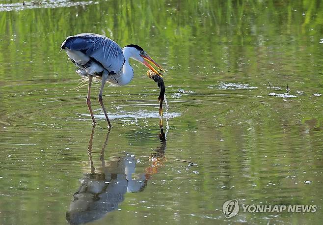 (강릉=연합뉴스) 유형재 기자 = 12일 강원 강릉시 경포천에서 왜가리가 물고기를 사냥하고 있다. 2025.6.12