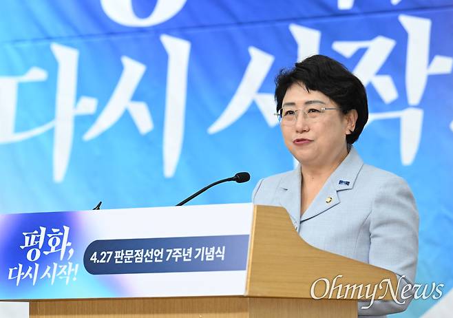 | ▲ 김선민 조국혁신당 대표 권한대행이 지난 4월 25일 서울 여의도 국회도서관에서 열린 4.27 판문점선언 7주년 기념식에 참석해 축사를 하고 있다. |
