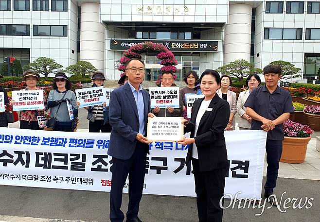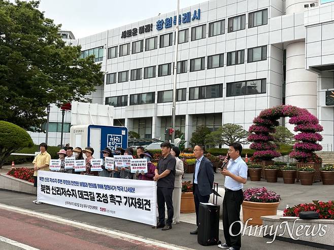 주민대책위는 12일 오후 창원시청 앞에서 기자회견을 열어 "신리 저수지 주변 주민의 안전한 보행과 편의를 위한 데크길 조성에 창원시가 적극 나서라"라고 촉구했다.
