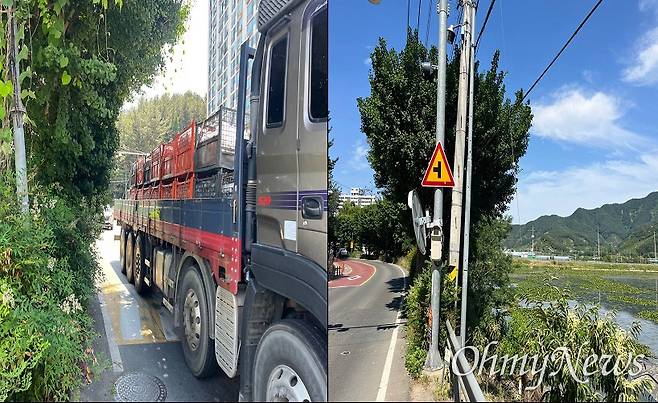 | ▲ 창원 북면 신촌저수지 도로에 인도가 없어 보행자들이 위험한 상황이다. |