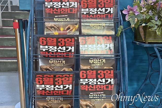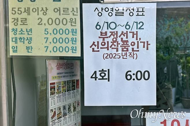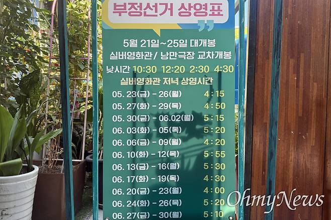 <오마이뉴스>가 11일 찾은 서울 종로구 낙원상가 4층 실버영화관, '허리우드클래식' 상영관과 '낭만극장' 상영관에서 5월 21~25일 매일 4번 다큐멘터리 영화 <부정선거, 신의 작품인가>를 상영했다는 안내문이 걸려 있었다. 또한 허리우드클래식 상영관에는 5월 23일~6월 30일 매일 오후 이 영화를 1회씩 상영한다는 공지도 붙어 있었다. 상영관 앞에는 "6월 3일 부정선거 확신한다!"라는 문구가 크게 담긴 포스터도 꽂혀 있었다.