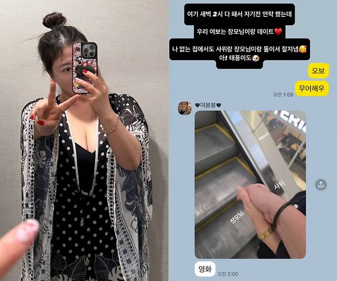 현재 미국 여행 중인 심진화는 잠자리에 들기 전 한국에 있는 김원효에게 "여보 뭐해요"라는 메시지를 보냈다. 이에 김원효는 장모님과 손을 꼭 잡고 있는 사진과 함께 "영화"라고 답했다.