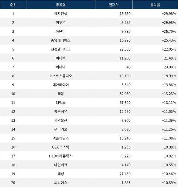 6위 이니텍(053350)은 종가 11,200원으로 21.48% 상승 마감했다. 7위 위니아(071460)는 종가 48원으로 20.00% 상승 마감했다. 8위 고스트스튜디오(950190)는 종가 10,400원으로 18.99% 상승 마감했다. 9위 대아티아이(045390)는 종가 5,340원으로 13.86% 상승 마감했다. 10위 태웅(044490)은 종가 32,950원으로 13.23% 상승 마감했다.