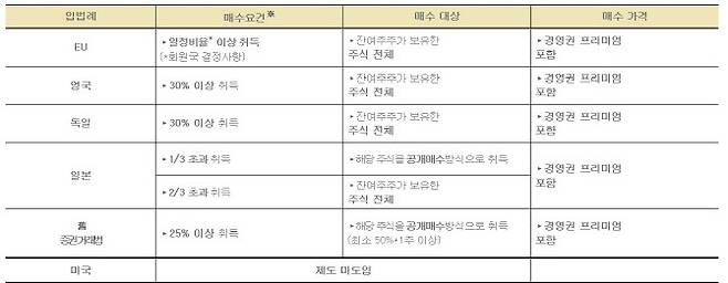12일 금융투자업계에 따르면 유럽연합(EU)은 경영권을 취득하는 경우 지분 전부에 대해 공개매수 의무를 부여하고 있다. 다만 경영권 취득에 대한 구체적인 기준은 각 국가별로 다르다.