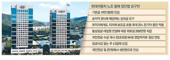 불확실한 글로벌 경영환경에도 불구하고 정년 연장, 주4.5일제 도입 등을 주장하는 현대자동차 노조가 퇴직자에 대한 전기차 할인 적용까지 임단협 요구안에 담은 것으로 파악됐다.