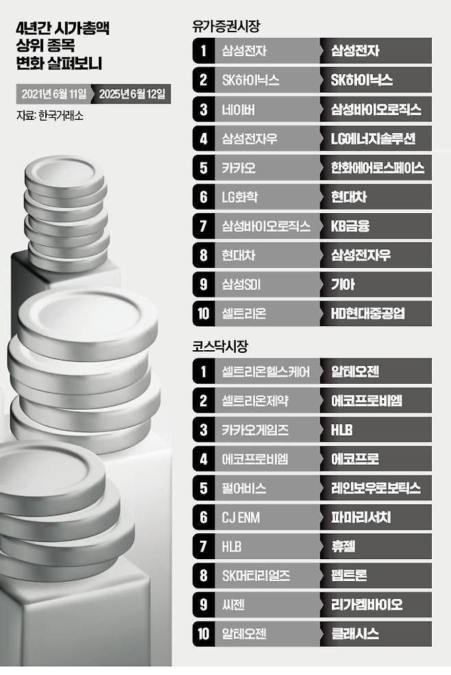 시총 3, 5위였던 네이버와 카카오가 4년 만에 각각 13, 21위로 미끄러졌다. 코로나19 엔데믹(풍토병화)과 금리 상승으로 플랫폼주 투자심리가 위축된 탓이다. 2차전지 관련주인 삼성SDI는 같은 기간 시총 9위에서 43위로 떨어졌다. 전기차 캐즘(일시적 수요 정체)과 도널드 트럼프 미국 행정부의 전기차 보조금 축소 등 대형 악재를 버티지 못했다.