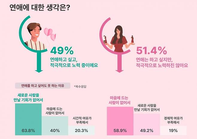 연애 의향에서도 성별 차이가 뚜렷했다. '연애를 하고 싶고 적극적으로 노력하고 있다'는 응답은 남성(49%)에서 가장 높았으며, 여성은 '연애를 하고 싶지만 적극적으로 노력하진 않는다'는 응답이 51.4%로 가장 많았다.