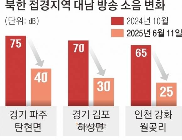 대남 방송 소음으로 고통받던 경기 김포시 하성면 후평마을, 인천 강화군 월곶리 연미정 인근도 이날 새벽 내내 고요했다. 군사분계선을 기준으로 9㎞ 떨어진 후평마을의 소음은 지난해 10월 측정 당시 공사장에서 나는 소음과 비슷한 70㏈이었지만 이날은 ‘야간에 침실에서 들리는 소리’ 수준인 30㏈이었다. 군사분계선에서 4.5㎞ 정도 떨어진 월곶리 연미정의 소음도 지난해 10월 65㏈(차량이 지나가는 대로변)에서 이날은 25㏈(조용한 스튜디오)로 측정됐다.
