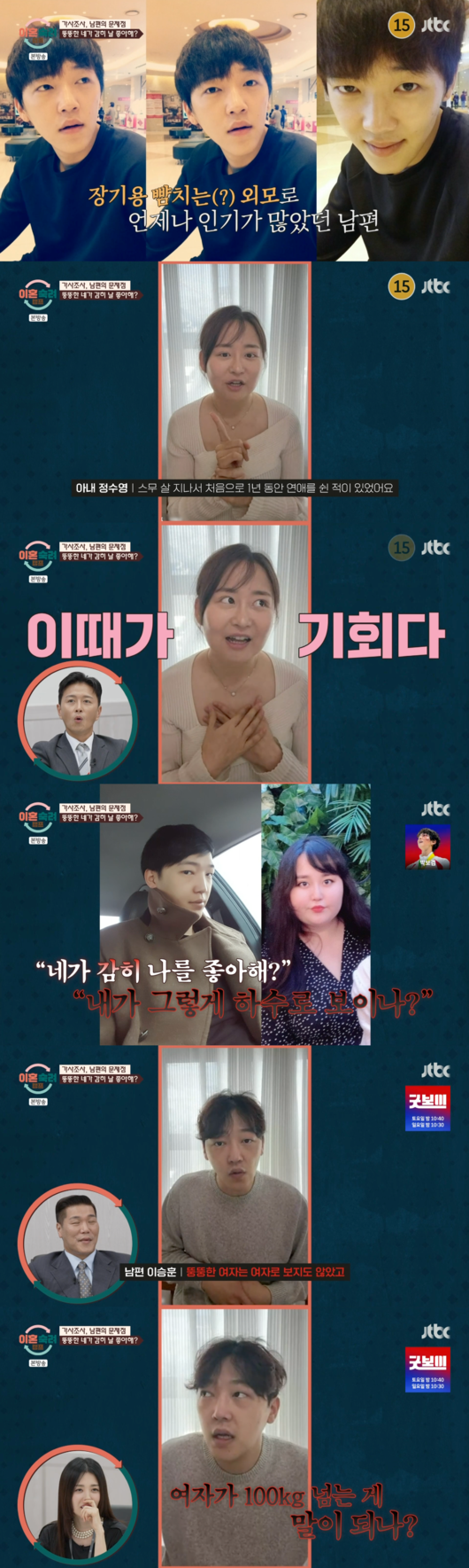 아내는 남편이 연애를 쉬던 시기를 노려 고백을 했다고. 남편은 “무슨 이런 X같은 경우가 다 있지? 네가 감히 나를 좋아해? 내가 그렇게 하수로 보이나?”라고 말해 모두를 충격에 빠지게 만들었다.남편은 “여자가 100kg가 넘는게 말이 되나? 뚱뚱하고 루저인 이미지가 크게 박혔다”라고 막말을 했다.